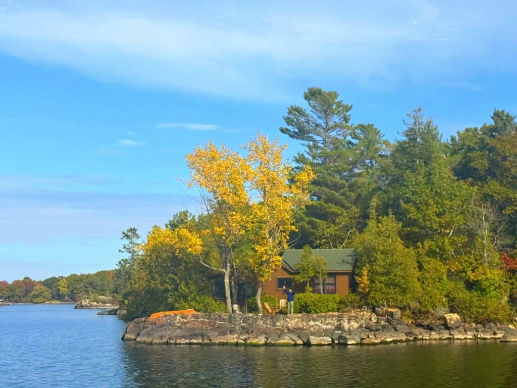 当船离开码头,阳光恰好破云而出。城市的钟楼渐渐远去,圣劳伦斯河被秋色铺满。岛屿一座接一座,有的不过是礁石与松树,有的却立着一栋石屋——有人说,这里曾有隐居的诗人,也有人在此度过一生。